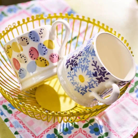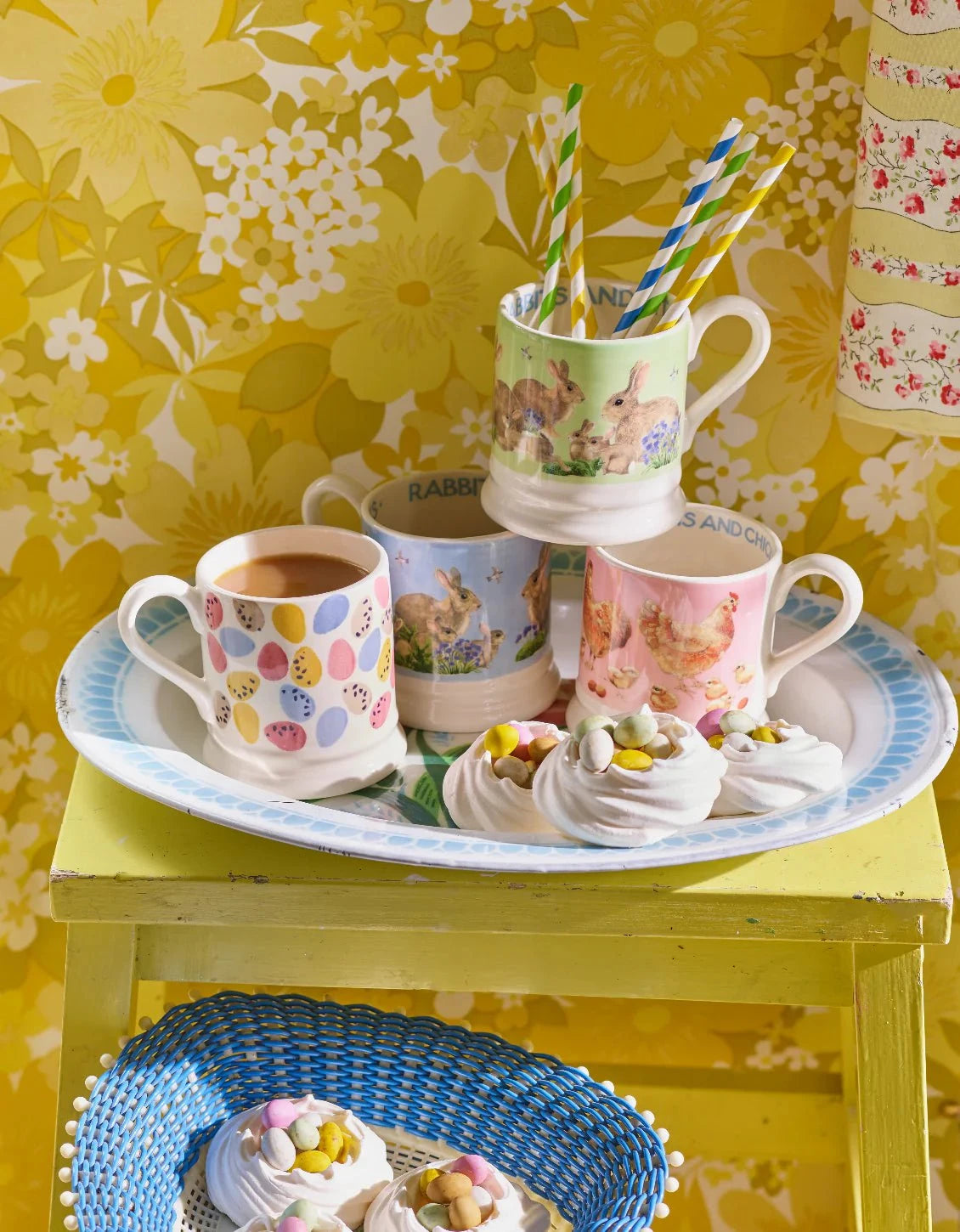 Now it is time for miniature arrangements- and lots of them- with tiny foil-wrapped eggs and sweet Easter chicks and bunnies tucked in between. Think clusters of primroses, pots of pansies and small jugs and jars filled with daffodils, their stems cut short so that their sunny heads can loll over the rims. Add in a few Spanish bluebells if you have any that have bullied their way into your garden (but remember never to pick the more delicate native variety, which are protected). Pink hyacinths from the local florist will add another candy colour pop.